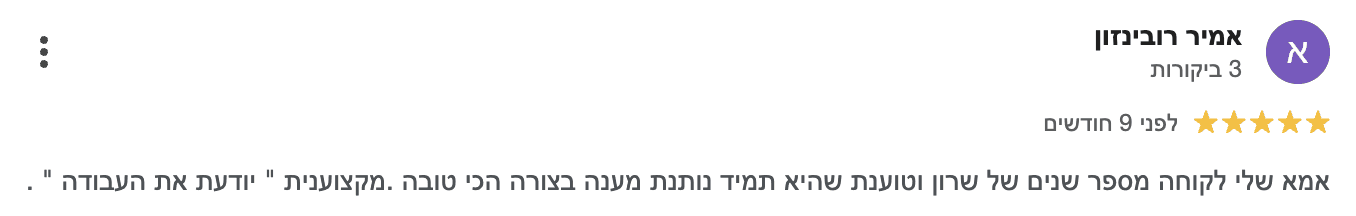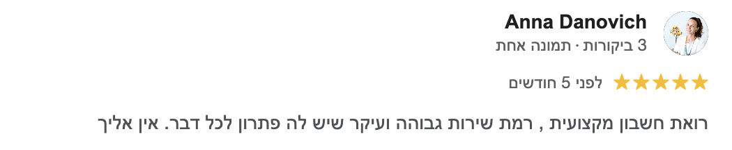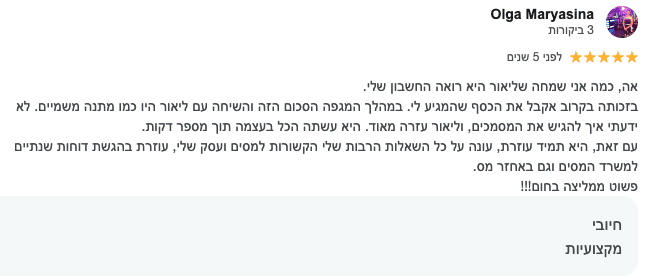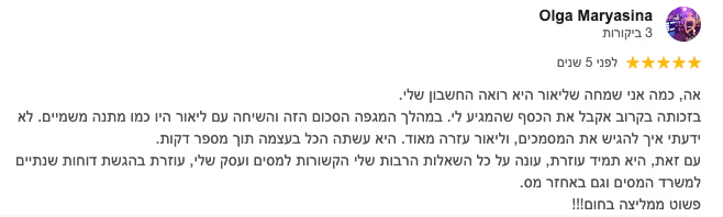 העובדה ש-90% מהגדילה של המשרד מבוססת על המלצות של לקוחות קיימים היא כרטיס הביקור הטוב ביותר שלי. אני מזמינה אותך להפסיק להתעסק בניירת ולהתחיל לראות איך העסק שלך